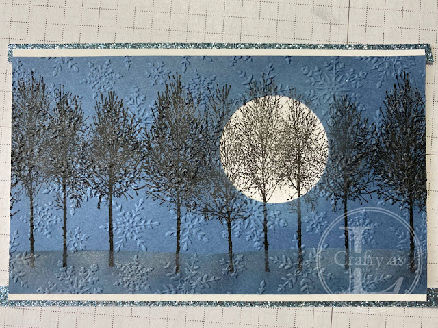 The moon was made by punching a circle from the blue layer and to add some more wintry feel, I ran the blue section through the Winter Snow embossing folder to cover with snowflakes. As I’d used the stamp positioner, my trees matched through the hole beautifully! I was mounting the card on a white card base so I needed an extra border which I made by cutting thing strips of Balmy Blue Glimmer paper.