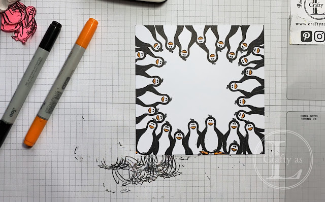 Next, to create my penguin border, I cut a piece of white card 5½” square and stamped the penguin from the Snowman Jack stamp set around the edge of the square. To make masks to enable the gaps to be filled, I stamped 3 penguins on a sticky note and fussy cut. These masks were then placed over the stamped penguins so I could stamp the next penguins behind the front row. This was repeated until the frame was complete.
