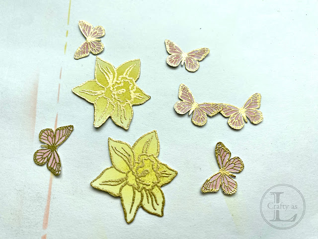 After drying the panel well, I gold heat-embossed the daffodils and sentiment from Golden Daffodils.