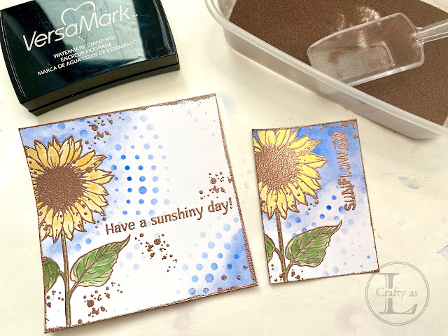 To finish the card panel and ATC, I heat-embossed the edges by dragging each edge across my Versamark pad and then adding the copper powder and heat-setting it.